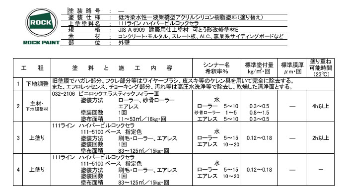 水 性 塗 料:ハイパービルロックセラ(111L)、サンフロンアクア(081L)、ビニロックウレタン(108L)、 ユニロックハイグロス(072L)、など