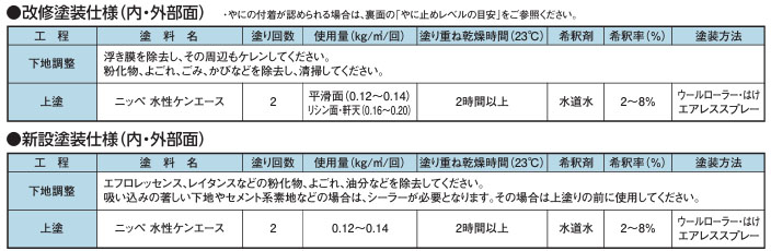 - コンクリート、モルタル、PC板、ブロック、スレートや鉄部(要サビ止め)、木部(内部に限る)各種旧塗膜。