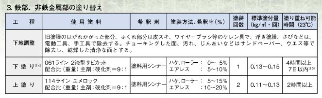 ・鉄部・アルミ・ステンレス(SUS304)・亜鉛メッキ:2液型サビカット 又サビカットII(1液型)*新設の溶融亜鉛メッキは不可。