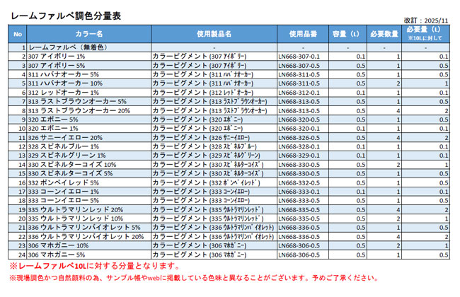 無着色のレームファルベに調色分量表のカラーピグメントを調合し、塗装します。