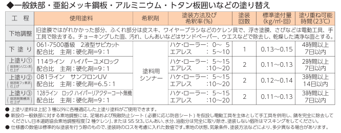 - 屋内/屋外の鉄部、亜鉛メッキ、アルミ、ステンレス、ガルバリウム(3年以上経過)、各種旧塗膜。