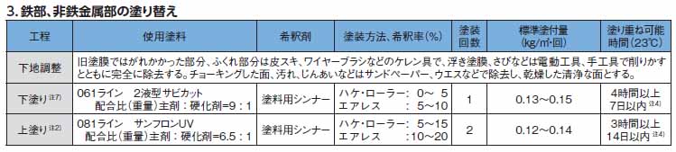 ・鉄部・アルミ・ステンレス(SUS304)・亜鉛メッキ:2液型サビカット 又サビカットII(1液型)*新設の溶融亜鉛メッキは不可。